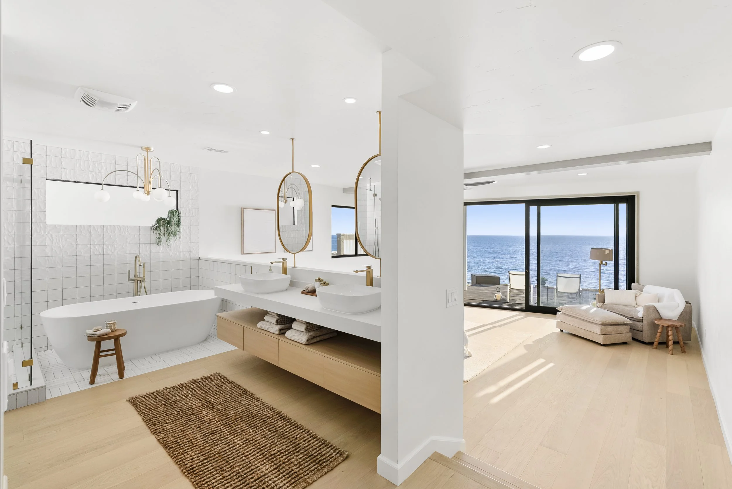 Design Vision: Our goal was to reimagine the interiors into an open, light-filled environment that connects seamlessly to the ocean beyond. By layering calming finishes, warm textures, and bold details, we created a space that balances functionality with personality.